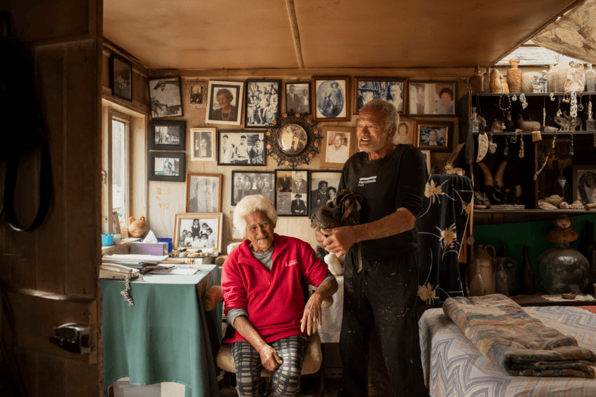 Dave’s home is full of his carvings and artwork, including a collection of kauri gum. They are photographed sitting in the home that he and his wife June raised six of her younger siblings, five of their own children and 47 foster children.