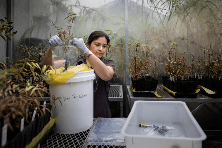 This kauri seedling was killed by Phythophthora agathidicida, a micro-organism causing kauri dieback. Chantal Probst is a research technician at Manaaki Whenua – Landcare Research. Landcare receives kauri seedlings from Scion and inoculates them with phytophthora. If the seedling dies, its roots are tested to confirm that the phytophthora infection caused its death.