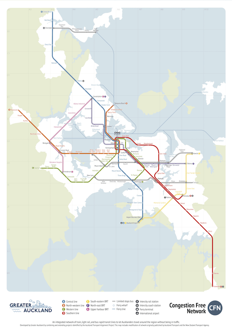 The CFN has been produced by Greater Auckland, the research and lobby group that used to be known as the Transport Blog. It’s actually version 2.0, an updated and rethought version of the first CFN, produced in 2013. Why a new one? Because the old one was so successful, Auckland Transport and the New Zealand Transport Agency quietly incorporated many of its ideas into the plans we have now, although they are progressing them way more slowly than anyone hoped. And because we now know more about the likely impact of growth in Auckland. The Unitary Plan requires an up-to-date transport plan. Greater Auckland offer theirs.
