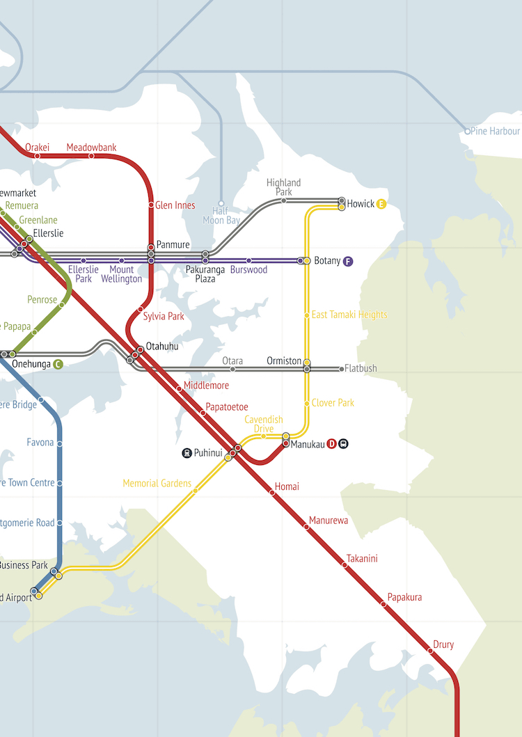 - A rapid bus route connecting Flat Bush and Ormiston in the east, through Otahuhu, Onehunga and Hillsborough, to New Lynn in the west. (Shown in grey.)