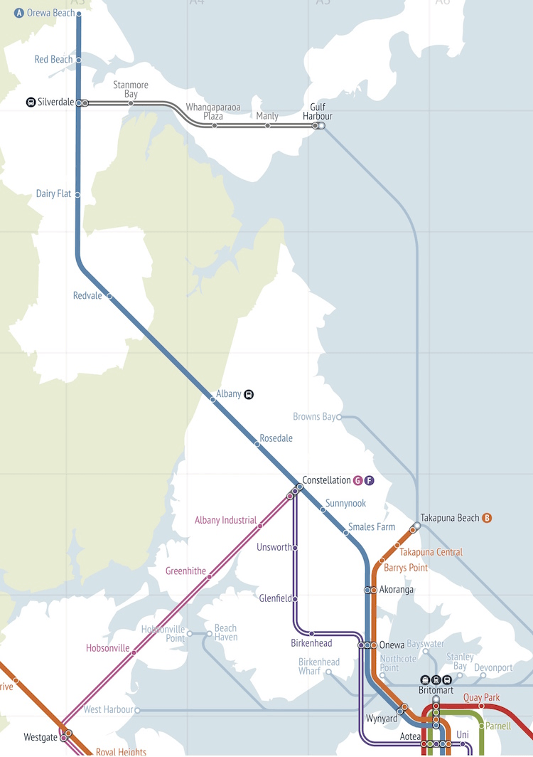 - A rapid bus route from Gulf Harbour on the Whangaparaoa Peninsula connecting to the Central Line at Silverdale. (Shown in grey.)