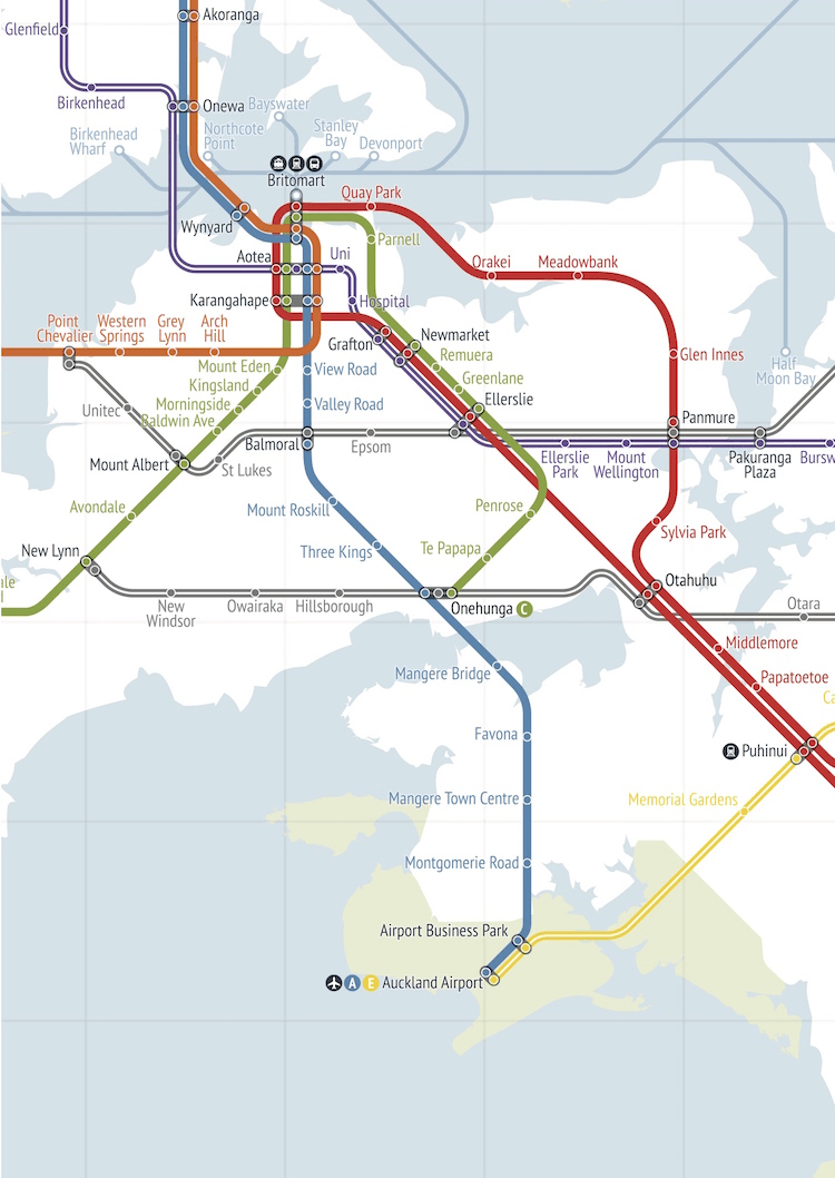 So: Te Atatu to Takapuna Beach by train. Henderson to the airport with one change. Orewa to the airport with no changes at all. The Western Line to the city with no stupid dead-end stop at Newmarket. Botany to Birkenhead; Howick to Pt Chevalier. Everywhere on one route to anywhere on another, with 11 major interchange stations, three of them underground on the City Rail Link. Smells like city spirit to me.