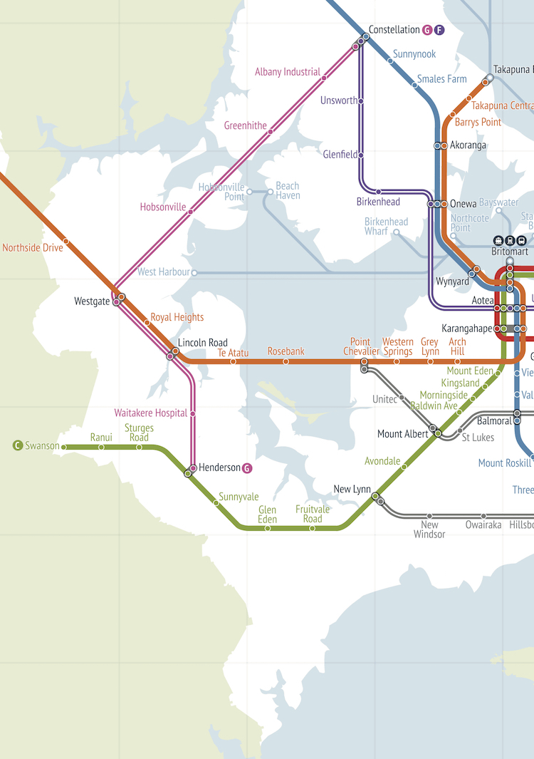 - Another BRT on the Upper Harbour Highway, linking Constellation with Hobsonville, Westgate and then Henderson. (Mauve route G.)