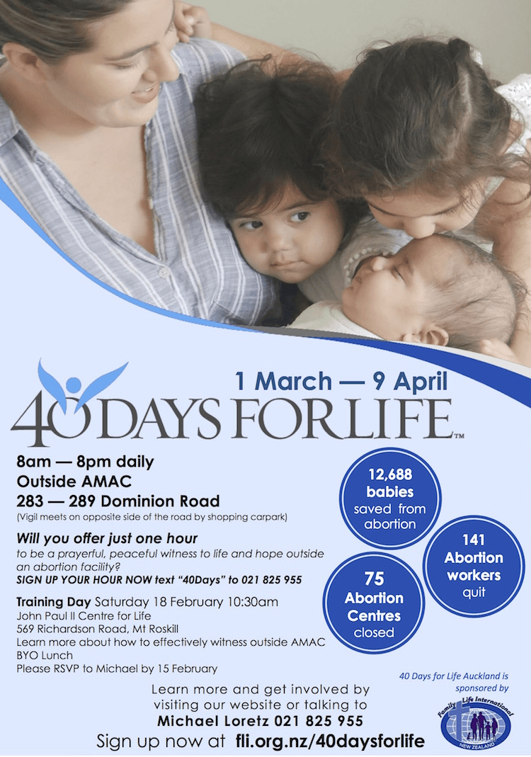 This has been the reality for AMAC staff over Lent. Family Life International NZ members have spent 12 hours every day standing outside the clinic as part of their Forty Days for Life campaign. On Sunday evenings they gather to sing hymns and turn the other cheek to barbs flung from passing cars. After Lent they’ll revert back to gathering once a week.