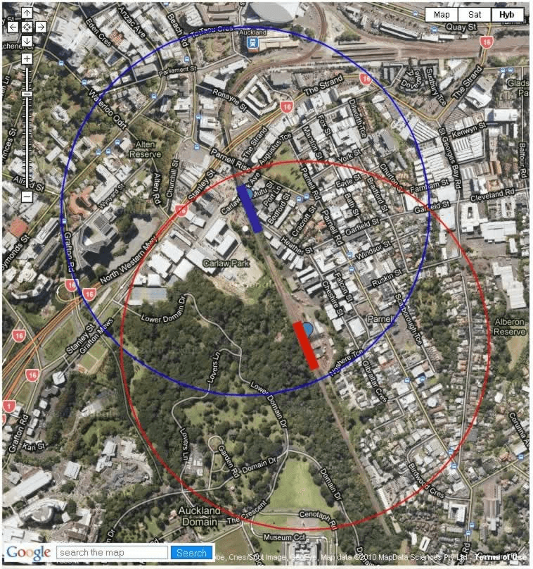 This one decision sealed the fate of Parnell Station to forever be an also-ran. This decision moved the station 400m further away from Carlaw Park, 400m further away from the University, further away from Beach Road, Quay Park, and further away from the part of Parnell that most Parnellites actually live and work in. It pushed the station into a gully where a full half of the catchment is a bush covered corner of the Domain, a place where a few hardy joggers visit during the day and nobody visits at night. This location moved the station away from any possible connecting buses, at the base of steep narrow alleys where buses cannot go, even if you did want to put them through the tortuous diversion.