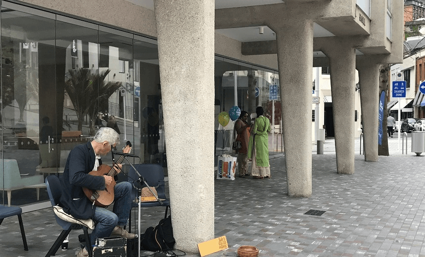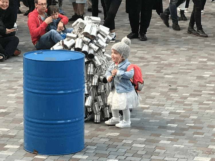 I sat on one of the big concrete steps in the newly refurbished Freyberg Place on Tuesday evening, watching a man covered in tin cans beating sticks on a blue 44-gallon drum. A little girl in a fairy skirt went up to him, walked around him, took one of his drumsticks, played with the tin cans, talked quietly to him and he to her, and she had the time of her life. Everyone there was having the time of their life. We all took a lot of photos. It was Artweek, Tin Can Man (Chris O’Connor) was a performer, the crowd was out for a good time.
