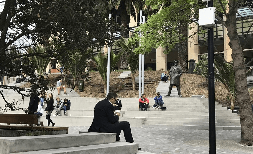 A few days earlier I sat in the Helen Clark Room on the ground floor of the also-refurbished Ellen Melville Hall, the modernist masterpiece that sits on the north side of the square, for a talk by a visiting transport planner. The gloom of evening settled outside. People strolled, sat, simply enjoyed being there. Only a couple of cars drove through.