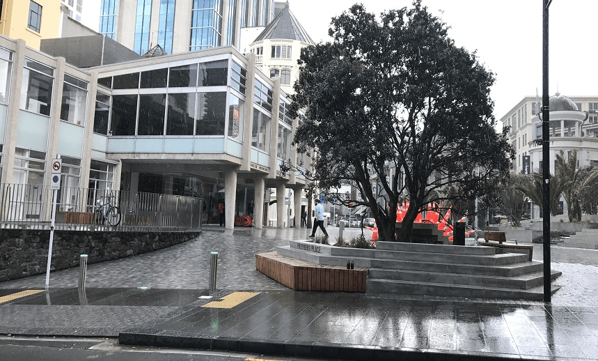 I asked Ludo Campbell-Reid about the lack of shelter on Twitter: “Hey Ludo, it’s raining on Freyberg Place and I can’t find the sheltered seats,” and it became quite a conversation.