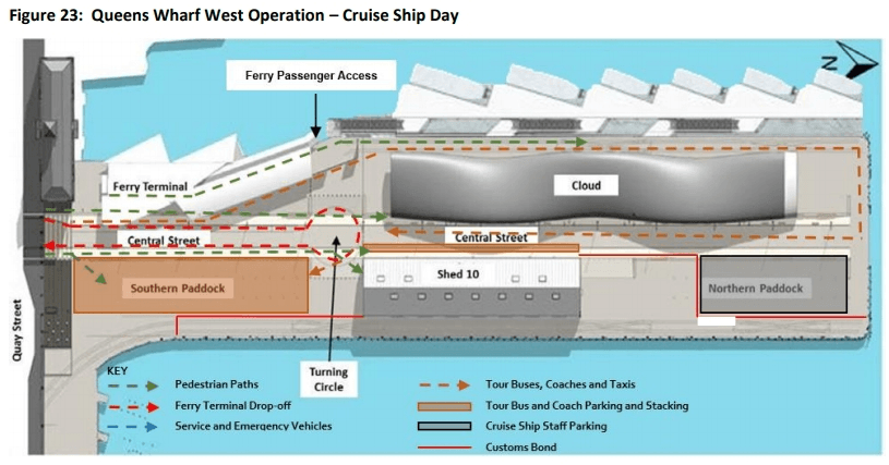 The movement is also shown below. Buses will enter the wharf, drive up the western side of the Cloud and then through what is meant to be the public space so they can pull up alongside Shed 10 to collect the cruise ship passengers. This is another example where the movement and storage of vehicles has been prioritised over people.