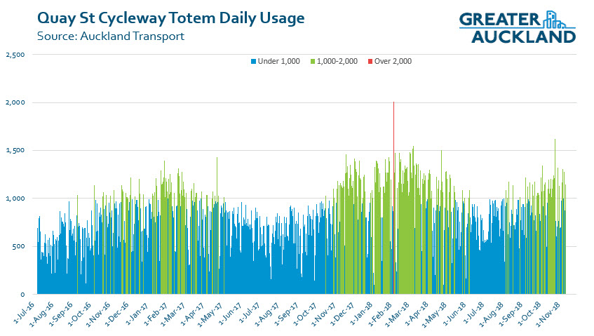 Last October, it saw an average 380 trips a day, and this October it leapt to 505 trips a day. At this steady clip, it will hit the predicted 986 trips per day by the end of 2020. Probably even sooner, given the new Ian McKinnon Drive cycleway opening at the end of November, and a proper connection through to the Viaduct, and the Cook St and Victoria St cycleways to come.