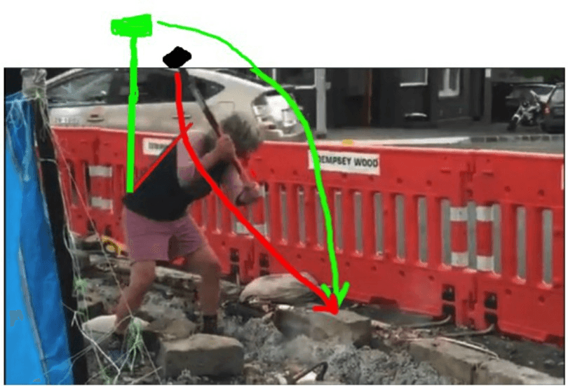 This is perhaps Prager’s biggest technical error. While her left hand is well placed at the bottom of the handle, her right hand is far too low to be generating any sort of useful power. When swinging a tool such as a sledge, your strong hand should begin right up the top of the handle, basically touching the metal head. This allows for more control as you swing and encourages a higher back swing. A higher swing equals a longer arc equals more downward power generated. Which brings us to…