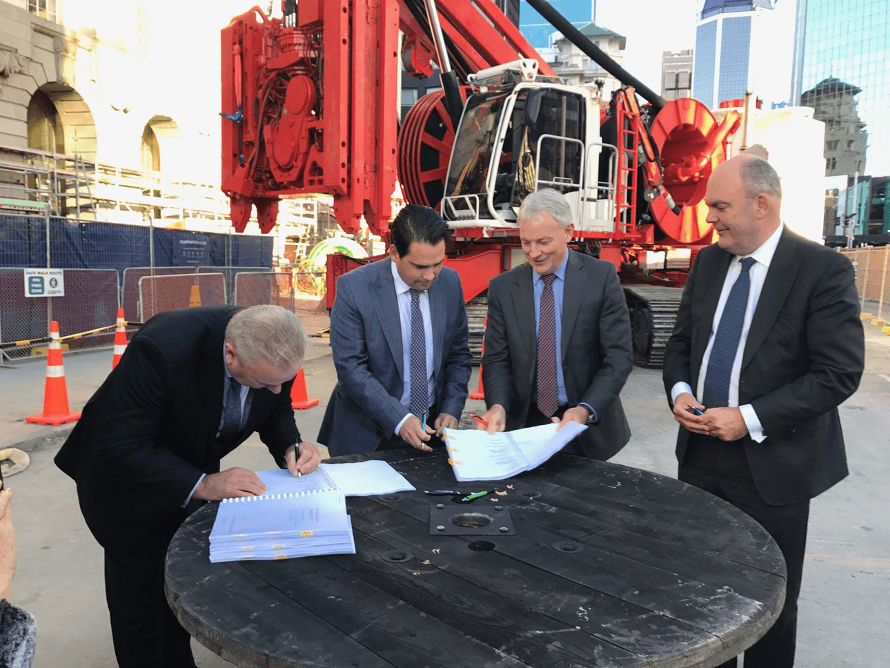 On the second-to-last day of June, government and council lawyers worked through the night to make the men – they are all men – responsible for our first underground railway look good. And in the cold winter light of the following afternoon their work was manifest: those men of the moment signed into existence the CRLL. Not a typo: that’s City Rail Link Limited, the central/local government joint-venture company that has taken over the running of the CRL. And there they were, grinning away in front of their brand-new bright-red digger: finance minister Steven Joyce, transport minister Simon Bridges, mayor Phil Goff, deputy mayor Bill Cashmore and project director Chris Meale.