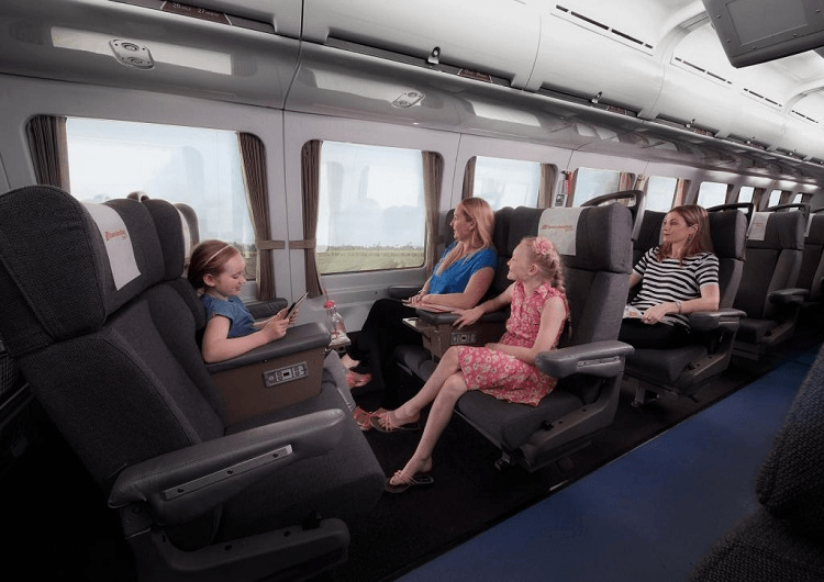 The trains are dual diesel-electric and can carry 300 people in four cars per unit, or 600 if run as a double unit. The seats will swivel, so groups of four people can face each other. GA proposes a fleet of 17 trains, costing $200 million, with another $200 million spent on network upgrades. Most of the service would use the existing track, but a new section of straight double-tracked line would be laid from Mercer to past Rangiriri, skirting the Whangamarino swamp and speeding up travel times.