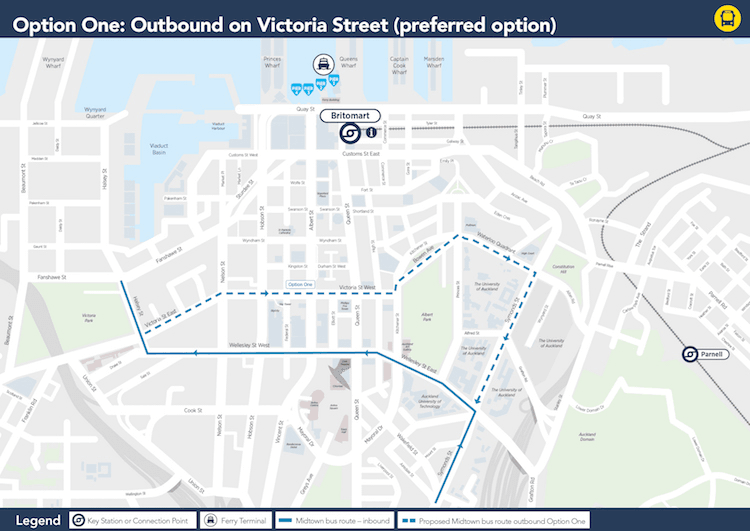 What about Option 3? It’s the same as Option 2 but has the outbound buses taking a dogleg from Wellesley St onto Mayoral Drive and then left up Wakefield St to Symonds St. The intersection at the corner with the library, AUT and art gallery would become much busier. And those students and staff at the north end of the UoA campus: they’d have further to walk.