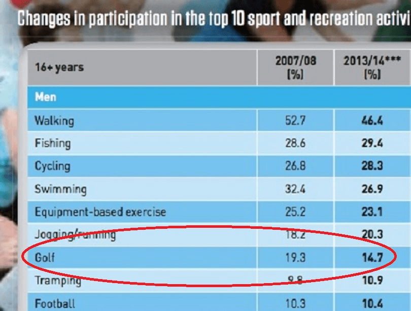 According to Sports NZ, golf is declining. Participation dropped 27% between 2007 and 2014.