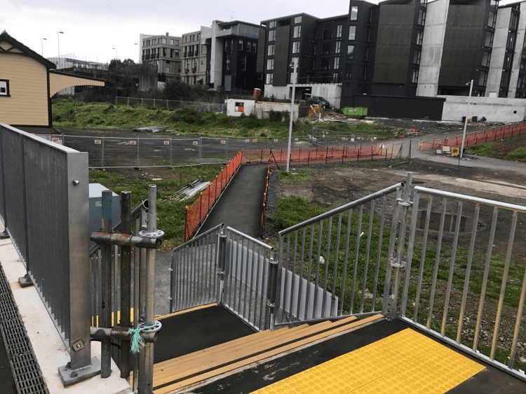 On the west side, there will be a walkway directly connecting the station with the new complex at Carlaw Park. It just hasn’t been built yet. It will link to an underpass (or possibly an overbridge) at the north end of the station, so you can catch trains going either way. It should open quite soon.