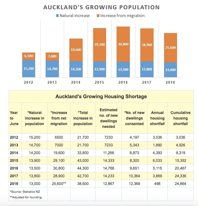 According to provisional estimates from Statistics NZ, Auckland’s population increased by 38,600 in the 12 months to June. Since Auckland has an average household occupancy of three people per dwelling according to the 2013 census, an additional 12,867 homes would be needed to keep pace with the region’s population growth.