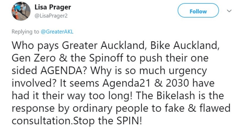 Lisa Prager, who led a revolt against a cycleway development in Grey Lynn and helped oppose public transport improvements in Mt Eden, believes The Spinoff, Generation Zero, and the advocacy group Greater Auckland are trying to enact “Agenda 21” – something that in reality is a set of United Nations resolutions about sustainability, but in the minds of conspiracy theorists are actually part of a plot to rob people and countries of their liberty through cycleways.