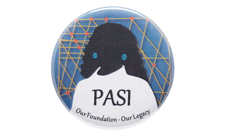 The design of the badge was based on a photograph of Teaiwa which showed one of her typical hairstyles and Pacific earrings (she would always wear at least one thing from the Pacific every day). Behind her is a rebbelib, a Marshallese navigational stick chart she owned. The silhouette concept was inspired by iconic images of American activist Angela Davis – one of Teaiwa’s academic supervisors and a friend – with her afro hair style.