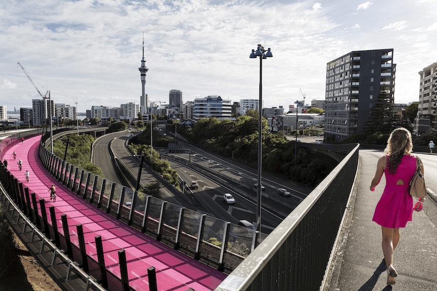 The Nelson Street Cycleway — or Lightpath: Te Ara i Whiti — is one of numerous projects around the world inspired by the 2009 High Line project in New York, in which an elevated section of a redundant Manhattan railway line was turned into a linear park. In Auckland’s case, an obsolete motorway offramp was repurposed as a cycleway and pedestrian path by architects Hamish Monk and Dean Mackenzie, and landscaper Henry Crothers. With its bright pink surface and highly visible night lighting, the Lightpath is both amenity and advertisement.