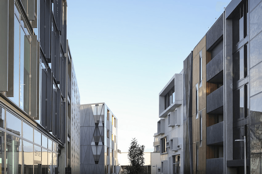 Vinegar Lane is an urban subdivision comprising around 30 six-metre-wide freehold lots on which four-storey, built-to-the-boundary terrace houses are progressively being constructed to designs by different architects. The project is a fortuitous outcome of the 2008 GFC, which killed off a planned commercial development that disregarded the local building scale.