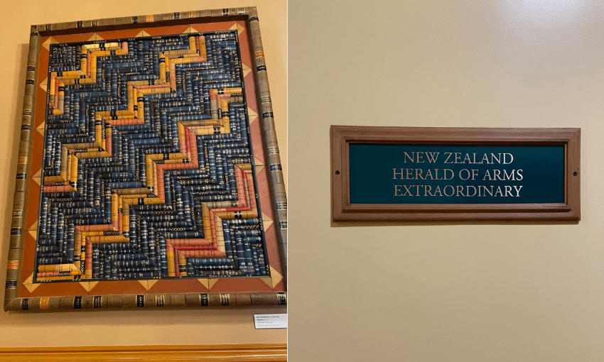 Parliament has a famously great collection of New Zealand art and some of it is in the reading room at the library. My favourite one was Alan Wehipeihana and Daryl Gray’s piece called Poutama, made from book covers, wood and glue.