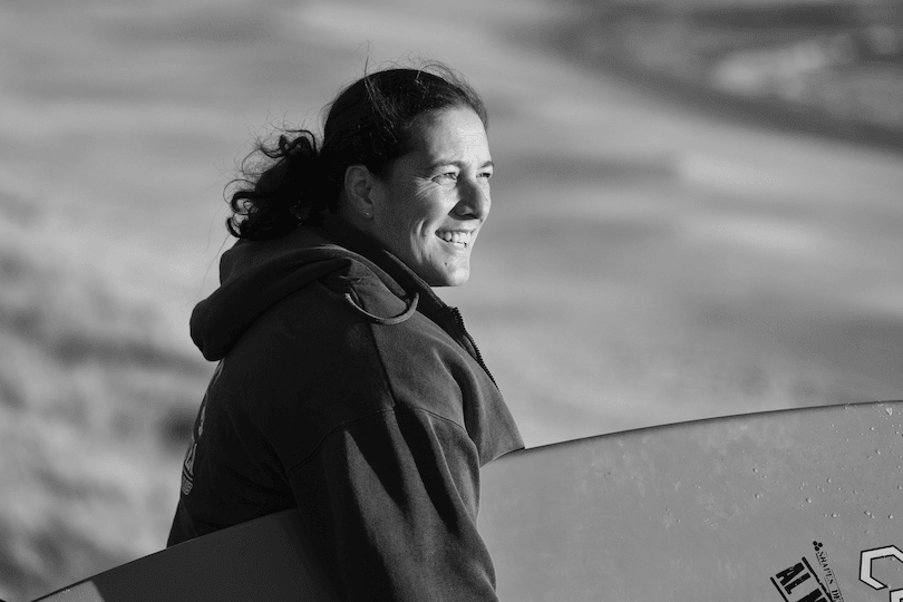 Stop. Go. It’s not her thing. The 39-year-old hates standing around. She gets bored quickly. This is a woman who cuts the sleeves off shirts to make them more practical and herself more blokesome. She has hair she doesn’t really know what to do with, so pulls it back to a single, unravelling ponytail, or muffles it under an ENZED beanie. Biceps. Real bloke biceps. And forearms. The result of roadwork and paddling out to catch the best breaks.