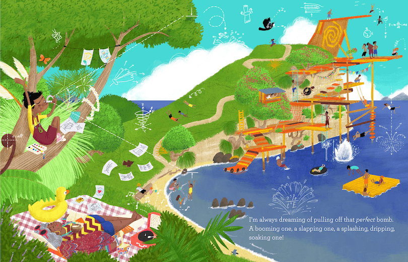 The drawings are intricate: a jetty is wonderfully higgledy-piggledy, perspective is played with, there are physics equations scribbled inside splashes. And listen to the words! Read silently they bop about pleasingly; out loud they’re a delight: “I’m always dreaming of pulling off that perfect bomb. A booming one, a slapping one, a splashing, dripping, soaking one!”