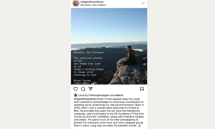 Ella Borrie: Brian Turner is one of Otago’s great poets. He was a renaissance man – accomplished in many ways – but I know him as one of my writing heroes. Landscape is a constant presence in his work. He understood how to capture Central Otago with sparse and sure language that echoed the place’s immense skies and hills. His poems often feel like proverbs; quiet excavations of larger truths. Brian Turner was a skilled and wise writer whose poems felt like a conduit for understanding the world more fully. I keep his books on my bedside table and his work will always be instrumental to my creative life. Words from his own poem Through seem fitting to farewell one of Aotearoa’s best poets: