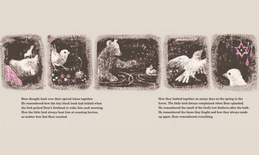 This book’s been around for a while and it remains a poignant picture book to introduce young children to the various stages of loss. Bear’s best friend, a little bird, has died and he is heartbroken. Initially unable to share the memory of his lost friend with anyone willing to listen, Bear is left feeling more distraught and alone. Not the cheeriest of topics to dip into but with utmost care the writer and illustrator reveal the complexity of grief, and that navigating through one’s feelings eventually leads to new journeys and friendships to be made. The simple, textured black and white woodcut-style illustrations, with increasing splashes of pink, convey a deeply tender and healing odyssey. (Reviewed by Roger.)