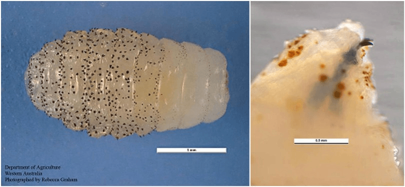 “The flies lay their eggs, which hatch into grubs called larvae. They have sharp fangs with which they bite a hole in your skin and crawl inside. The skin closes over except for a breathing hole and they grow and grow inside their little cave.”