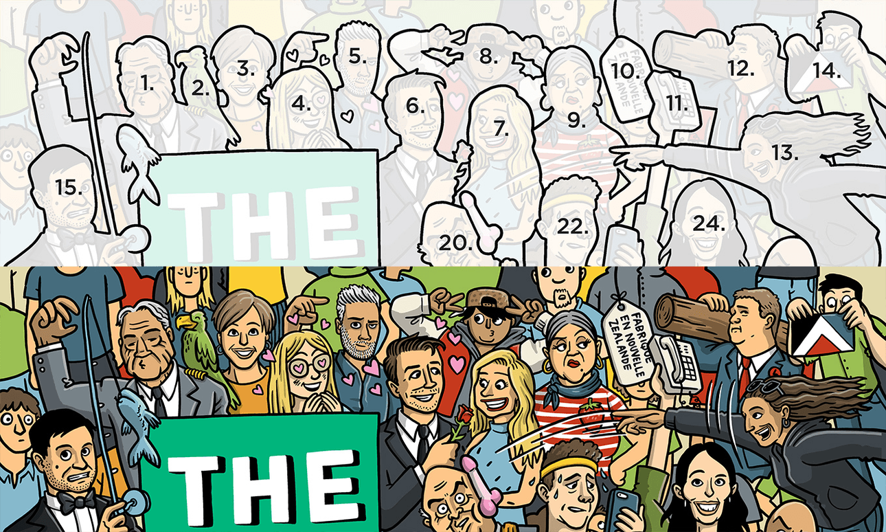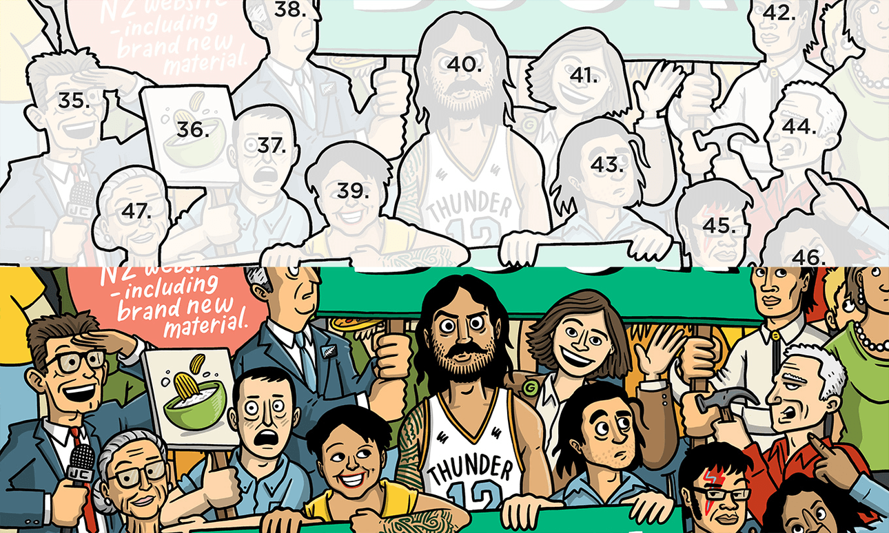 Last week The Spinoff released its first ever book. The cover is a crowd of mostly familiar faces, inked by illustrator Toby Morris. See how many you can identify, then read Toby explain who these people are, why they’re there and which was the biggest bitch to draw.