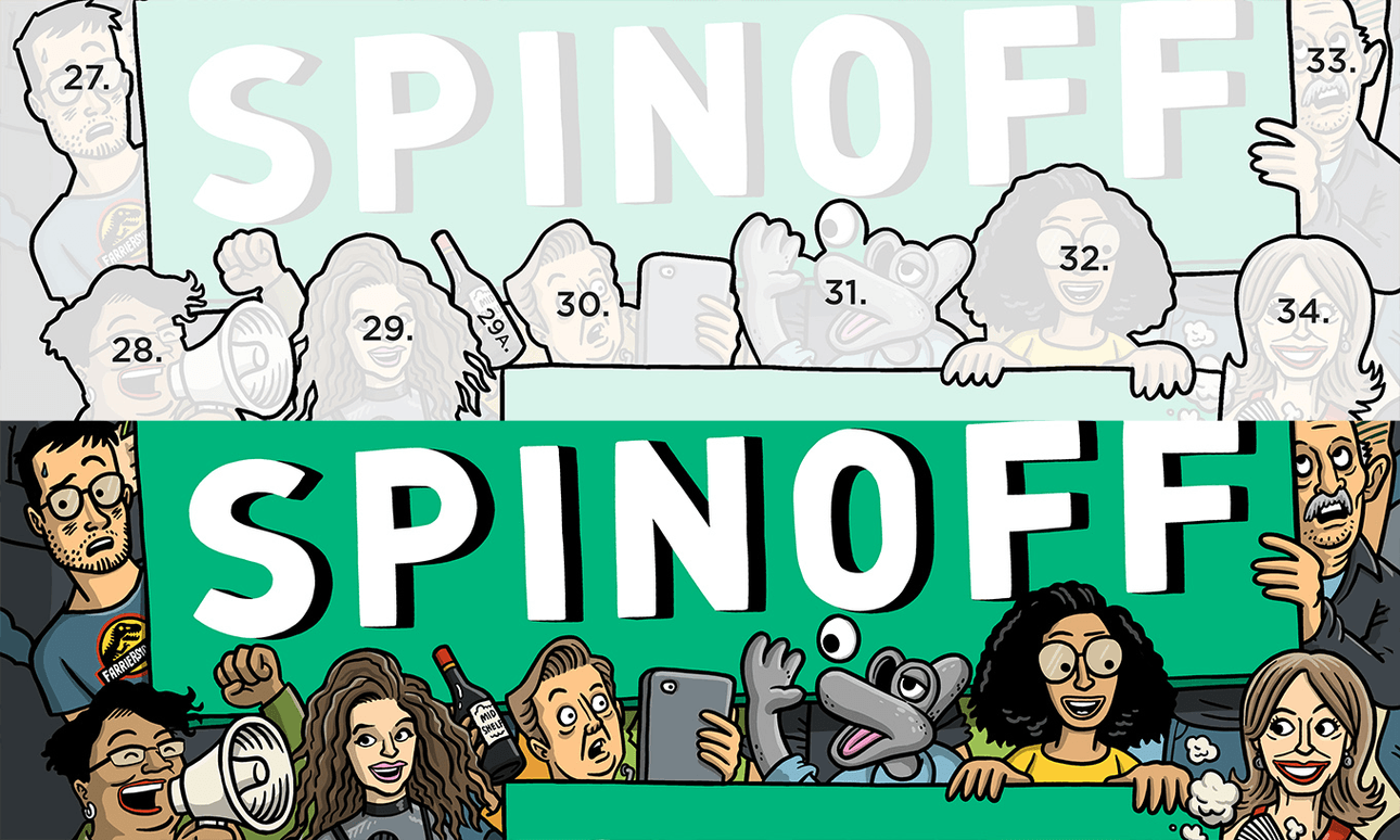 How do you sum up a book that’s most distinctive feature is the breadth of different content inside? That covers politics, pop culture and all the weird bits in between? Fairly early on, we decided the cover of the book would have to represent the range of different voices and subject matters inside, and one of my first ideas was to do a mad jumble of characters as if they’re either at a party or a protest. I wanted to show people who’ve written for The Spinoff, or we’ve written about – a range of politicians, pop stars, beloved TV characters and maybe a few of our writers too – with a few beloved scumbags mixed in for fun.