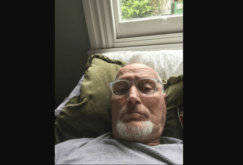 So this photo [below] is by way of a…..corrective. It’s me feeling crook. The inside reality. After my third chemo I seemed to suffer from a deep tiredness. So deep I could barely summon up the energy to move from one room to another. I also had thrush really badly in my mouth. It’s so demoralising when you can’t speak or eat, two of my favourite activities. So this is the obverse of my “looking so well” in public. It’s an act – but a very good act. And like all actors in the end sometimes I can’t tell which part is truth, which is fiction.