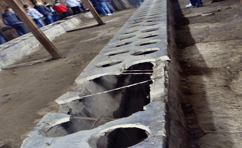 Then I saw the latrine barrack designed to serve about 7000 inmates. It was a shed with three open sewer drains, each with two rows of holes for toilet seats formed into the concrete slab bridging them. Later I came across Terrence Des Pres’s description of the conditions as an “excremental assault” designed to destroy the last vestiges of prisoners’ self-worth and dignity.