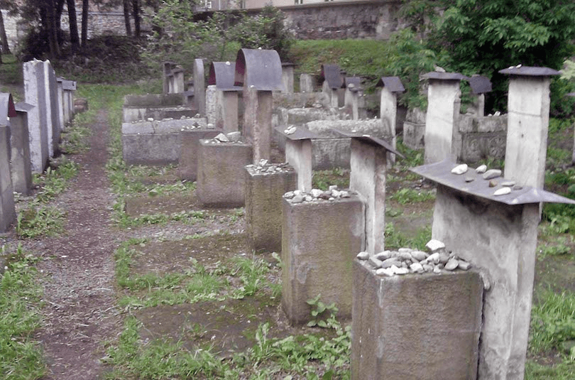 The Remuh cemetery in the Kazimierz district of Krakow was lined with rows of worn sandstone tombstones inscribed in Hebrew. Instead of flowers, there were small stones on the headstones, some weighing down scraps of paper marking a moment of memory, perhaps messages to a god. Like so much of Poland the place bore the scars of marauding hordes. At times in its history Remuh had been ransacked, most recently by the Nazis, and gravestones broken or taken for paving. Fragments of slabs recovered now make a mosaic on the inner side of the Szeroka Street wall.