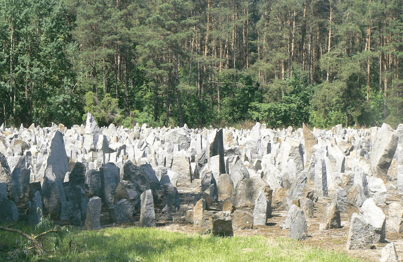 We drove to Treblinka where most of Diana’s father’s family had been slaughtered – some 17,000 jagged granite shards set into concrete in a vast forest clearing, symbolic graves to some 800,000 dead, their remains ploughed under the soil to conceal the crime. The serenity of the stones amidst encircling pine trees and the pale blue sky made an enormous silence demanding a response, but it was yet another place where it was impossible to speak.