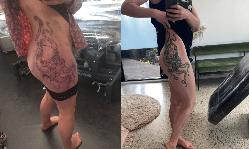 The idea of the octopus came to me on a walk at South Beach in Whanganui. While our kids and Oscar the dog ran through the dunes playing hide-and-seek, a friend and I talked about our love lives, as we often did. I was being ghosted again by an on-off boyfriend, after admitting I thought some of his writing featured misogynistic tropes. For the hundredth time, I was done with him. And I wanted something symbolic to ensure I wouldn’t go back, to him or anyone like him. Once, on another beach, he’d made a joke about accidentally seeing my genitalia, and “getting the fright of his life”. I might as well embrace that Freudian fear, I thought to myself. Writhing tentacles on my leg, a Medusa’s head, would help filter out anyone who was terrified of vulvas.