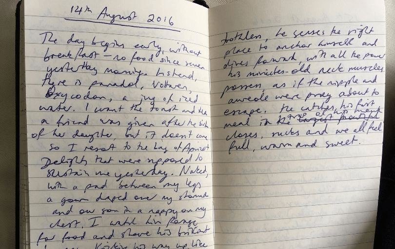 ‘Are you writing much?’ I was asked (but can’t remember when, or by whom). Yes and no. I was writing more regularly than I had in years, but these words were just another fluid to be expressed, a by-product of the birth, sharing the same pages as the record of feeds, sleeps and excretions, dotted with sprays of foremilk. Technically, this was writing, but not the sort that counts. Just compulsion. Free therapy to moderate my mood and monitor my mental changes – trying to trace how the shrinking grey matter and specialised neural networks defined as “baby brain” were manifesting for me.