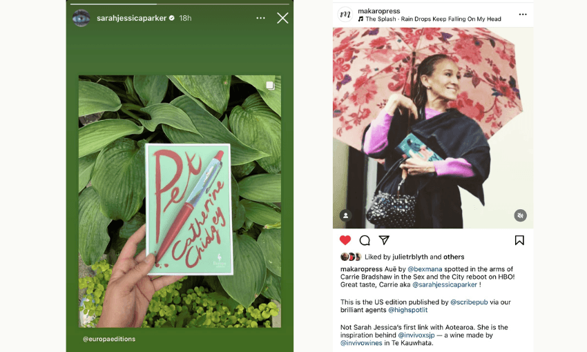 Carrie Bradshaw, aka Sarah Jessica Parker, aka one of the most famous people in the world, has a thing for New Zealand books. Or so it appears. Just yesterday she posted a picture of Catherine Chidgey’s latest (fantastic) novel, Pet, to her stories on Instagram which has 9.3M followers, spruiking both Chidgey and Europa Editions, the UK-based publisher of Pet. “[Fellow author] Rachael King messaged me the screenshot on Facebook at 9.30pm,” Chidgey told us. “I have no idea how to drive Instagram, so I spent the next 40 minutes sending Rachael messages like ‘How do I see it?’, then finally calling her so she could talk me through it like a very patient IT person. It’s an extraordinary thing to happen – I’m thrilled! I splashed it all over social media, and then I was so excited I couldn’t get to sleep till 2am.”