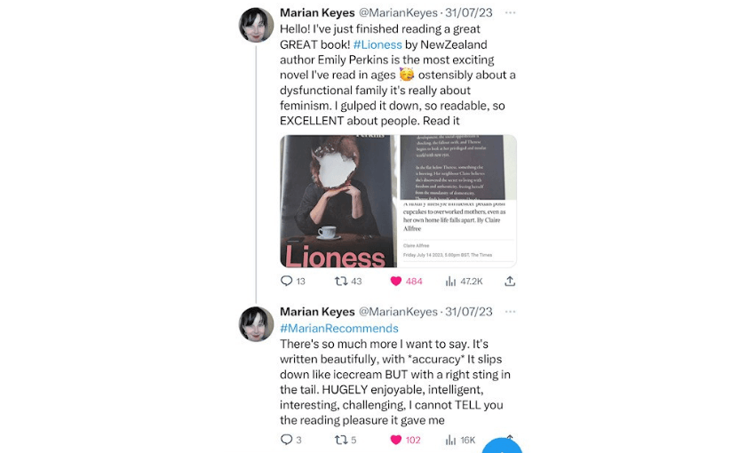 Only a bit over a week ago, mega star Irish writer Marian Keyes (of the Sushi for Beginners fame) sent out a two-tweet thread on just how much she loved Lioness by Emily Perkins, one of our best novelists. “Hello! I’ve just finished reading a great GREAT book! #Lioness by NewZealand author Emily Perkins is the most exciting novel I’ve read in ages…” the thread begins.