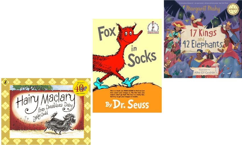 Fox in Socks. A classic Dr Seuss tongue-twister, it’s such a great read-aloud book. I have many fond memories of reading it to my children as quickly as humanly possible.