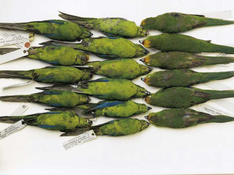 I couldn’t touch any of the bird specimens, of course – one of the reasons being that the older specimens are preserved with arsenic – and so Colin helped me place the birds in the various arrangements you see in this book. Only a few of them are mounted; the rest are what are called study skins. Te Papa has 11,600 skins of New Zealand birds, ranging across 290 species, mostly endemic but also exotic. The older ones are closed and stitched around a stuffing that taxidermists call tow – a mix of coarse linen and hemp fibre; more recent study skins are closed around foam plastic or cotton wool. They all lie on their backs in trays, mostly alongside others. Their feathers have lost none of the vivid quality of life. Their claws are very apparent. Sometimes a metal rod, inserted for ease of handling, protrudes through the centre of the filled cavity. I didn’t try to duck this fact with the photos, as this was one of the things that drew me to the project: depicting these fantastic objects as they are stored. These are specimens and they were collected for science; and many of them still serve a scientific purpose now that DNA testing can draw important information from the feathers of very old specimens.
