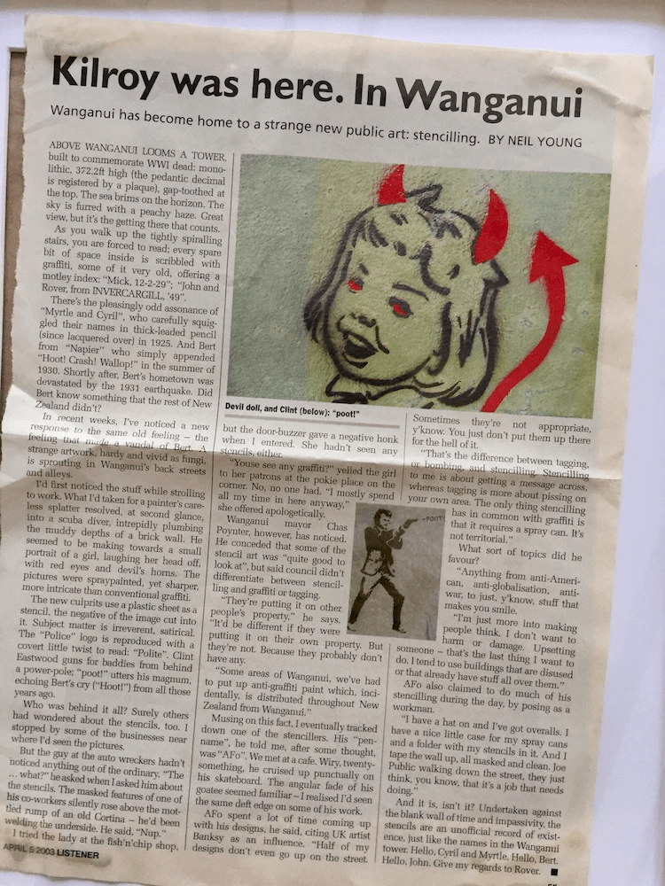 You recently showed me a copy of that fantastic story Neil sent to me at the Listener when I worked there – the one about a mysterious stencil artist making Banksy-ish art in Whanganui. Re-reading it was amazing, actually; it was such a pleasure working with Neil on that story, and he wrote such a terrific piece, but re-reading it was a revelation – it was even better than I remembered. So detailed, and funny. Do you remember when that came out? What did you think of that, as a nascent writer, that he wrote something as good as that and it was published in a magazine which at the time was first-class? I guess you were like, what, 17, 18, or something; did it make a big impression on Ashleigh of Te Kuiti?
