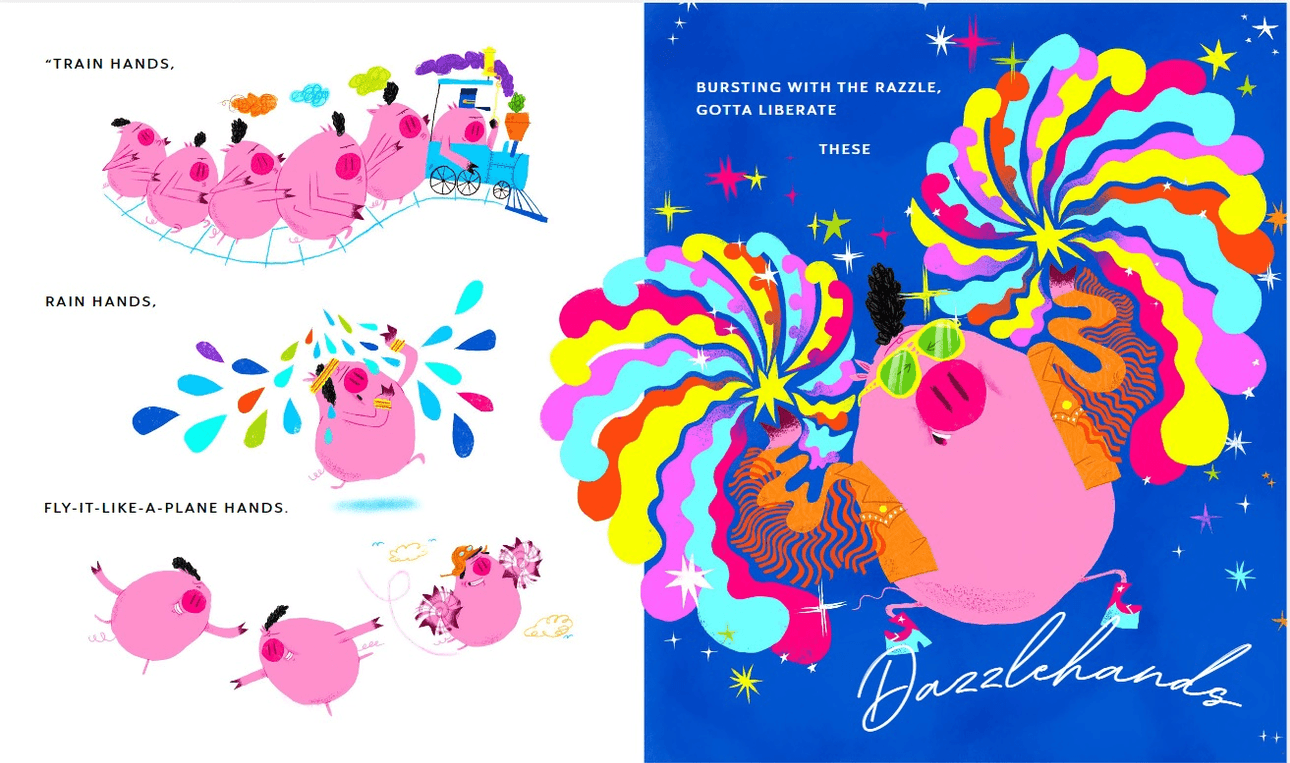 “Pigs don’t go Dazzlehands!” shouted my son on our first read, the beginnings of outright hysteria lacing his giggle. He immediately got the gag and from there on in we were laughing. The danger with contemplating a children’s book is the illusion of simplicity. Disrupting the collectively understood language of our animals might seem like a crisp joke, but everything in this book is designed to hook the readers in, hold them in thrall and move them along at the same time. Sacha Cotter is a genius at rhyme married with rhythm and this is where Dazzlehands comes alive.