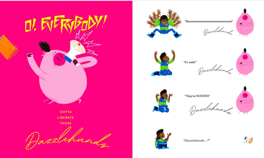 They’ve done it again. Sacha Cotter and Josh Morgan’s latest picture book – about a glam pig who has much more to offer than your standard oink – is a beautiful blast. This is the fourth collaboration between writer Cotter and illustrator Morgan (Te Aitanga-a-Māhaki, Rongowhakaata), and shows yet again that in the vast universe of picture books their stories shine ultra bright.
