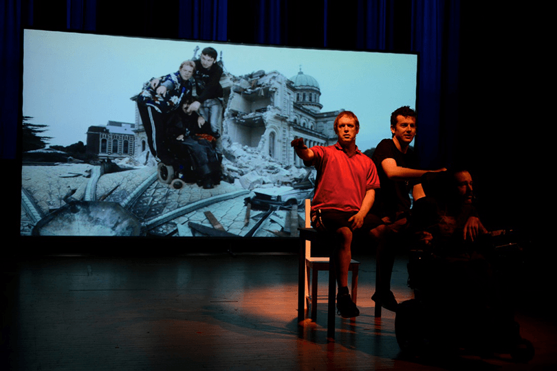 In an earlier production, Still Lives (2011-12), three performers – Glen Burrows, Ben Morris and Isaac Tait – collaborated in devising a piece ostensibly about the Christchurch earthquakes of 2010 and 2011 but more about their own sense of placelessness in the city both before and after the quakes. The piece made a direct comparison between the tectonic shifts of the earth and the bodily movements of Glen Burrows, an actor with cerebral palsy, a motorized wheelchair user, prone to seizures that he and his carers termed “sparking”.