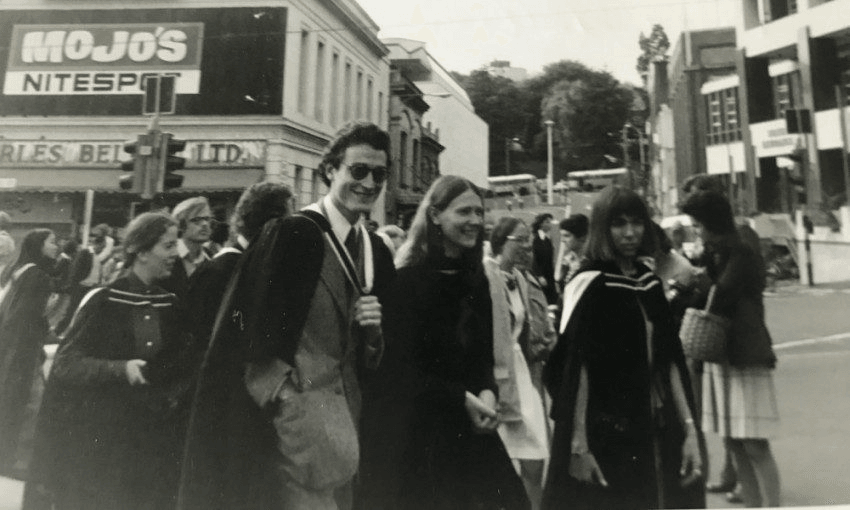 Every picture tells a story. 1973 Graduate Parade up Queen Street. Helen Clark and I were chosen to lead the MA graduates up the street. I particularly like this photo because Mojo’s is in the background. I’m wearing a second-hand brown herringbone tweed suit with a green tartan tie, and, out of shot, my brown two-tone platforms (hence why I tower over Helen.)