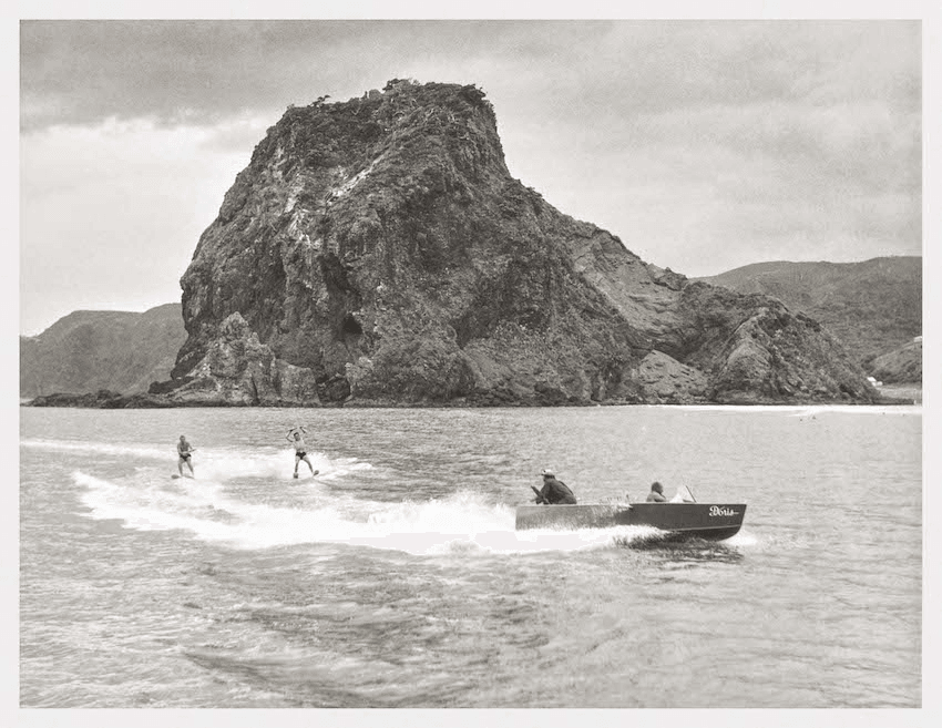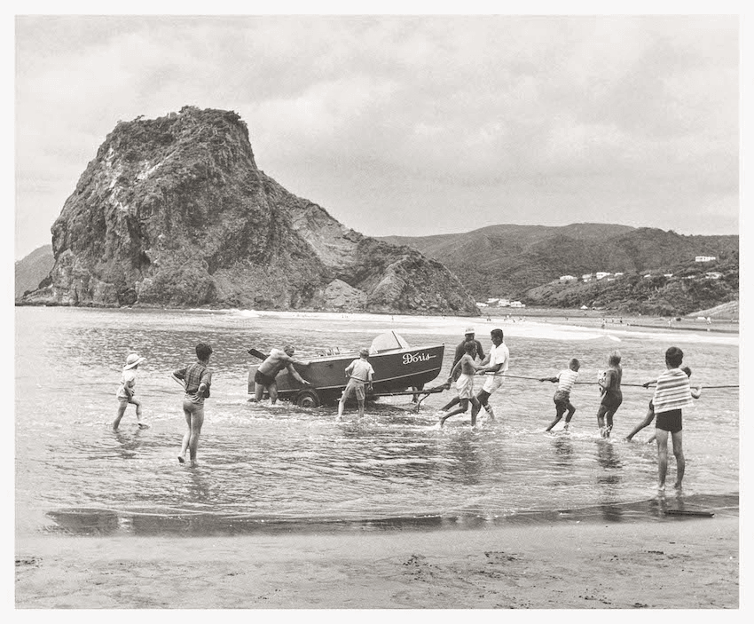 I am lucky enough to have spent my childhood – and indeed my whole life – in a bach with a suite of brilliant Olaf Petersen photographs on the walls. In the 1950s my father, Tom Pearce, owned a speedboat called Doris, named after my mother, Doris Margaret Pearce. Doris was painted a deep lipstick red, the name emblazoned on the bow in a white flourish. The boat was the typical speedboat of the era, built of wood, with the prow curving gently down to the water, rather than the later shark’s snout style.