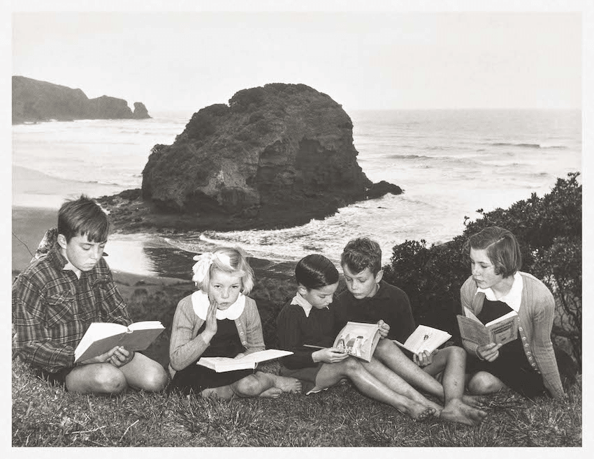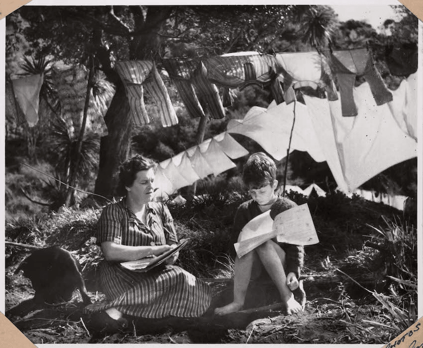 Petersen shows boy scouts but equally girl guides and rangers, and surely his marvellous 1964 photograph of Mrs Avis McIntosh training at leaping hurdles while her infant son looks on from his pushchair is the ultimate portrait of a woman multitasking. Douglas Vesey reclines on Muriwai Beach while a girl – presumably his daughter – competently holds a fishing hand line. He is watching and smiling, relaxed in the knowledge she knows what she is doing.